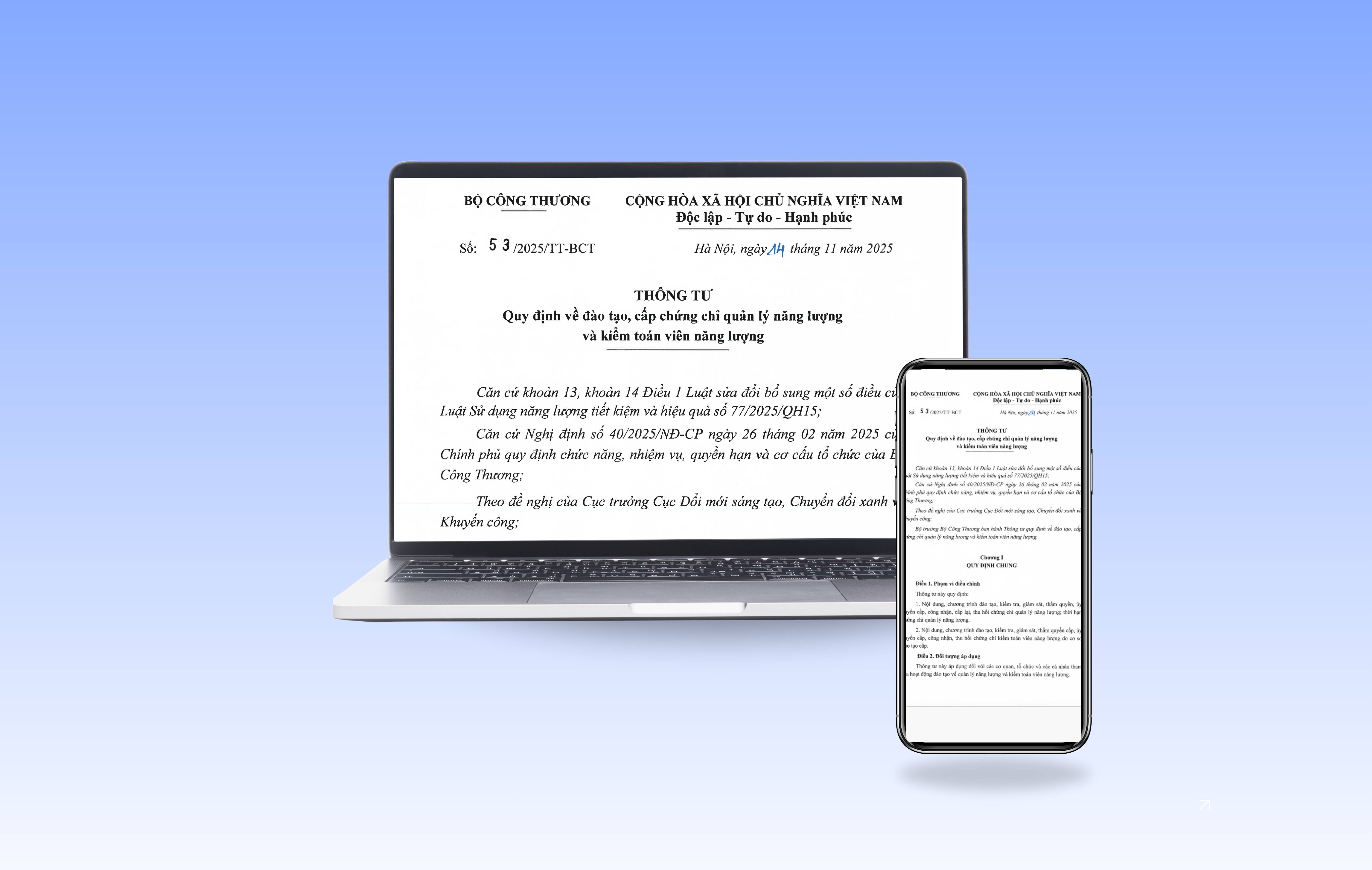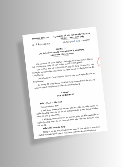 Bộ Công Thương đã ban hành Thông tư số 53/2025/TT-BCT ngày 14 tháng 11 năm 2025 quy định về đào tạo, cấp chứng chỉ quản lý năng lượng và kiểm toán viên năng lượng. Thông tư có hiệu lực từ ngày 01 tháng 01 năm 2026.
